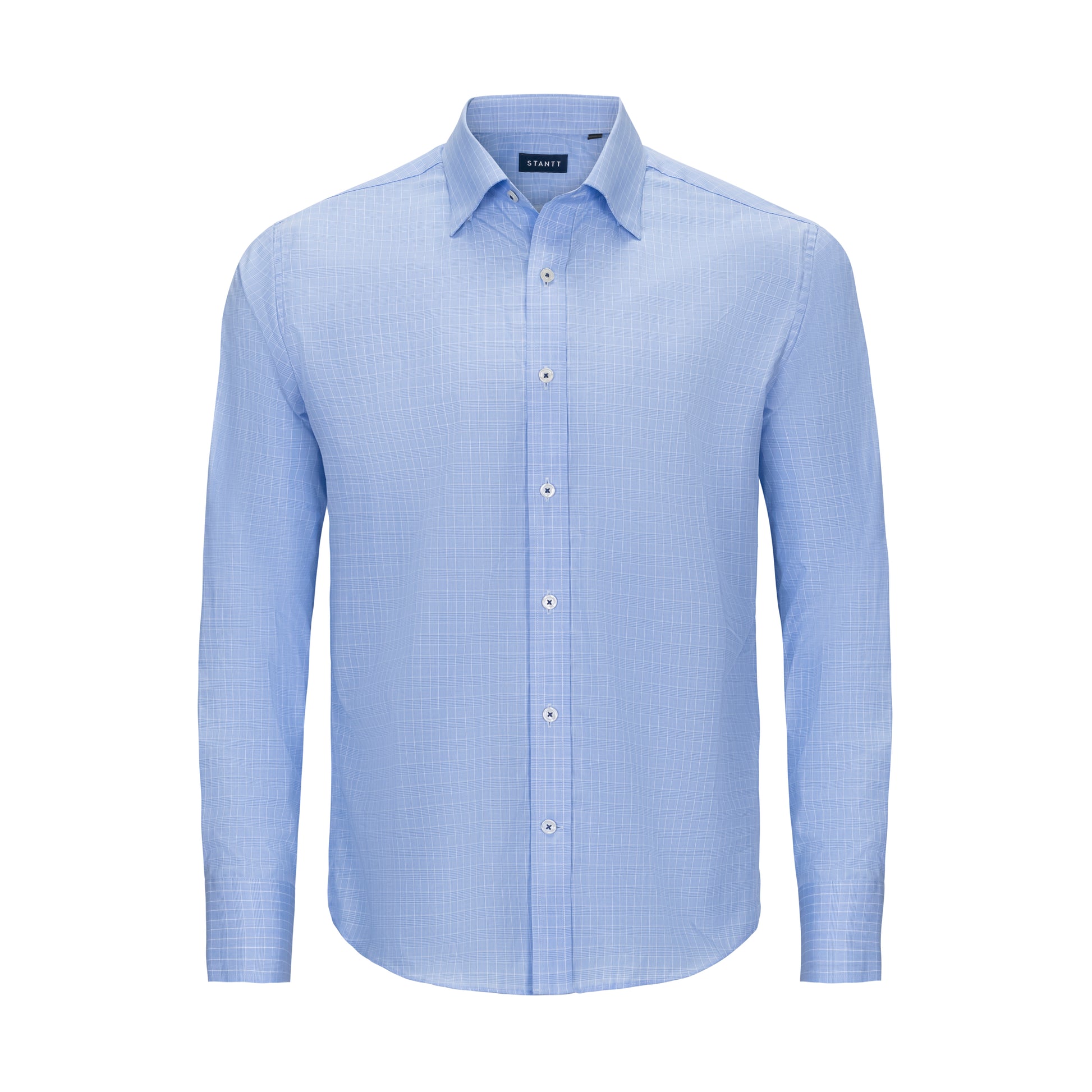 An easy to wear woven shirt from Stantt Untucked that is slightly shorter so you can wear it tucked or untucked! The hidden button-down collar is great for keeping your collar exactly where you want it, whether you are wearing it on its own or under a suit or sportcoat! The light blue Prine of Wales Check pattern features a white button with contrast blue stitching.