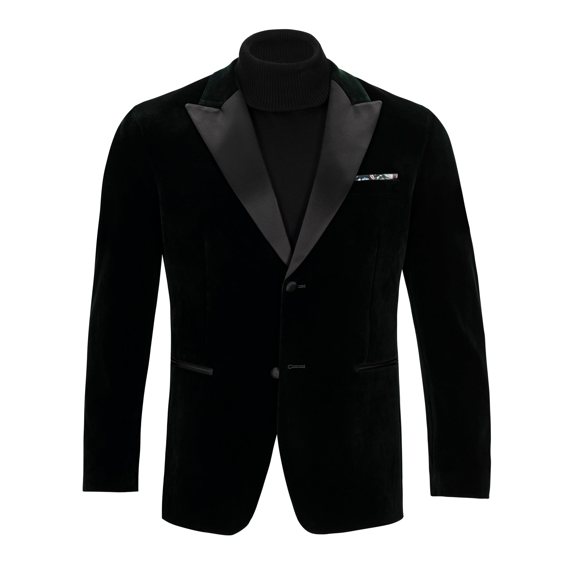 Make a bold statement at any formal event with this hunter green velvet dinner jacket. This jacket features a sleek satin peak lapel that exudes sophistication and a two-button closure for a refined silhouette. The interior is lined with a vibrant tropical pattern and matches the breast pocket lining that can be pulled out to wear as a pocket square. Along with elegant satin buttons, this jacket epitomizes evening wear perfection. Pair it with our Black Tie Preferred classic tuxedo pants, a Modena crisp white formal shirt, and a bow tie to command attention at black-tie affairs, weddings, or gala events.