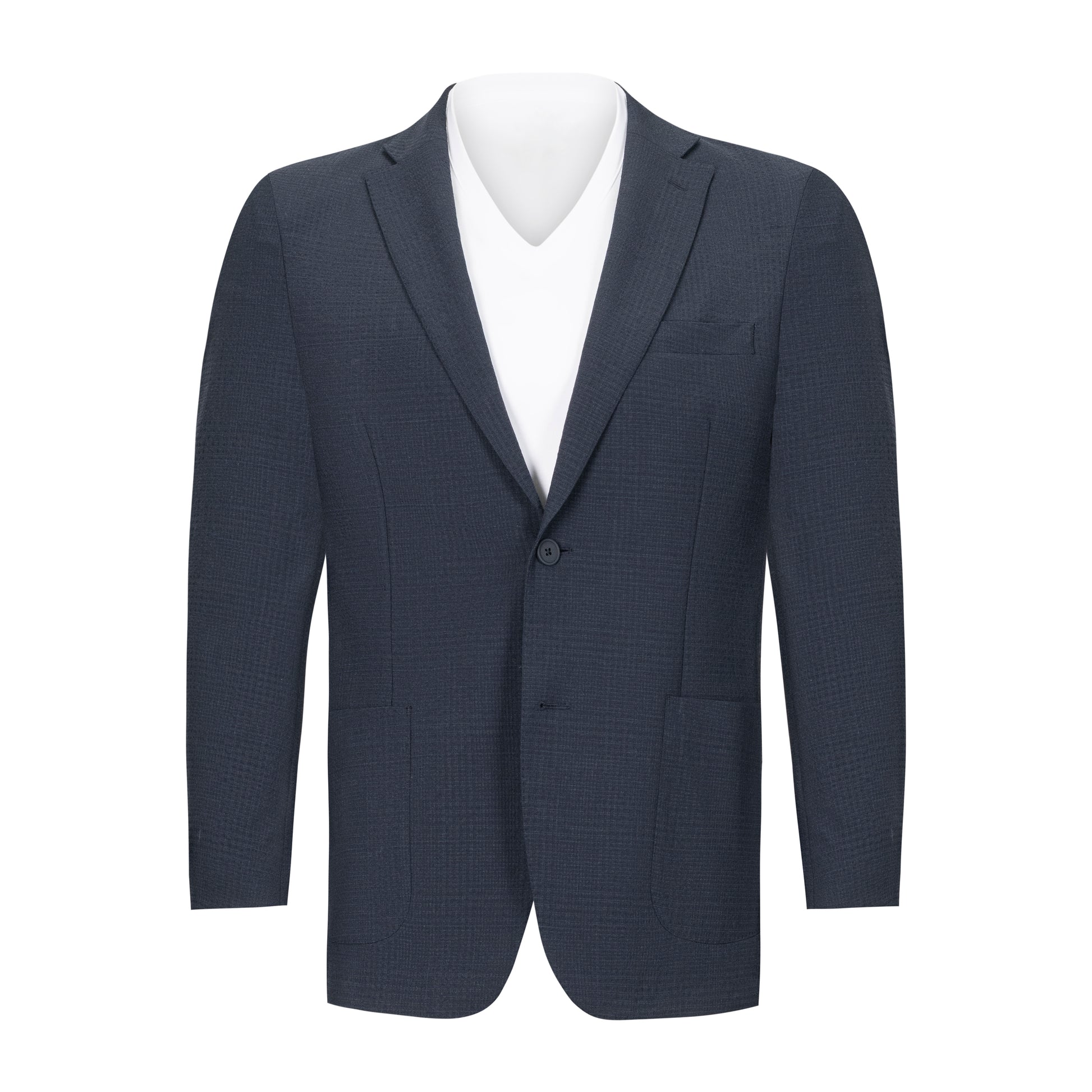 This jacket features a lightweight, refined mini seersucker pattern in a deep blue hue. It is styled with a classic two-button closure and a notch lapel, contributing to its polished look. The open patch pockets add a casual touch, making it versatile for both business and leisure. Whether paired with tailored trousers or dressed down with jeans, this Calvin Klein piece ensures a sleek, modern silhouette.