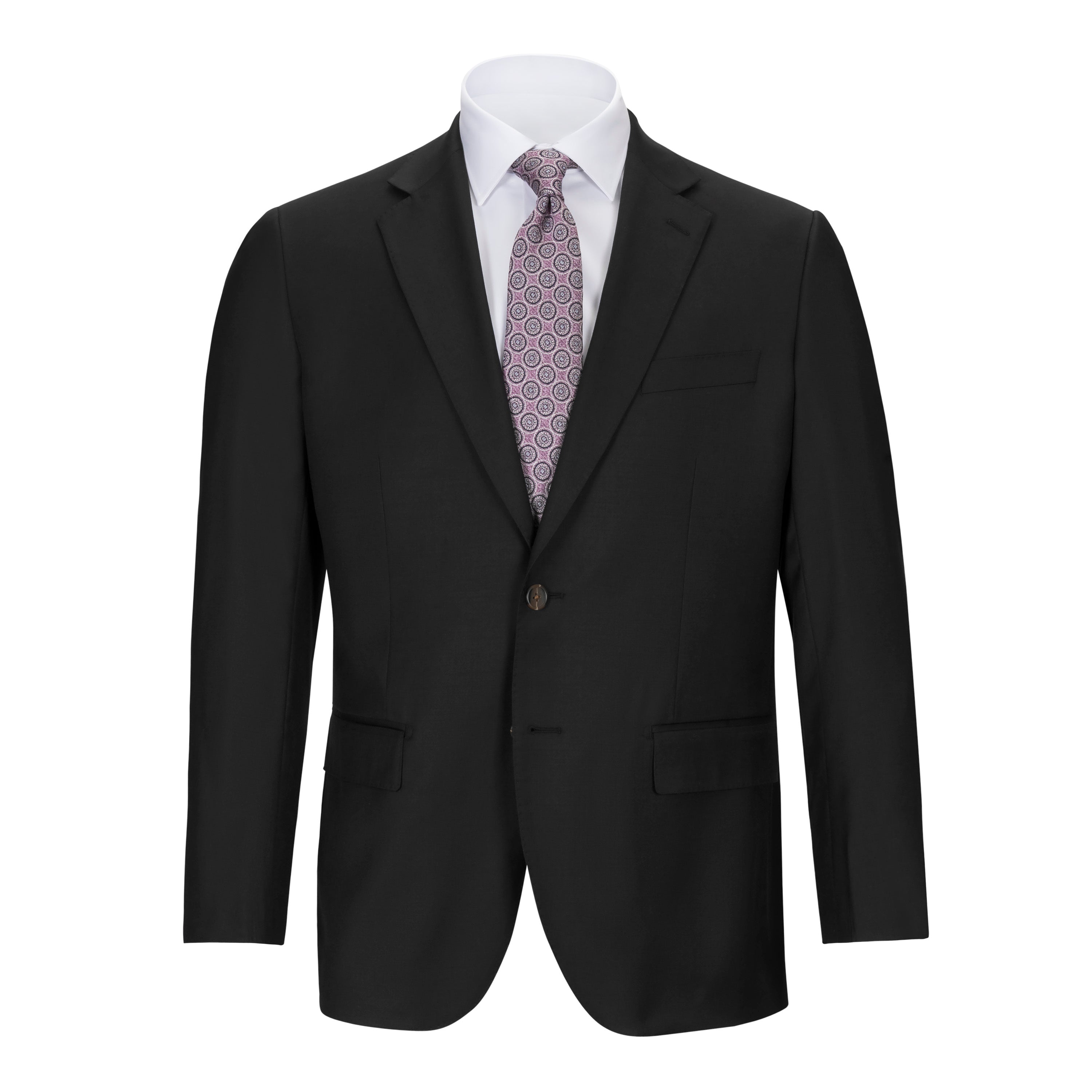 Made of Super 150s pure wool in a smooth finish year round weight wool, this wonderfully tailored suit features ½ canvas construction, two button front with flap pockets, side vent styling with pic stitching and flat front pants.